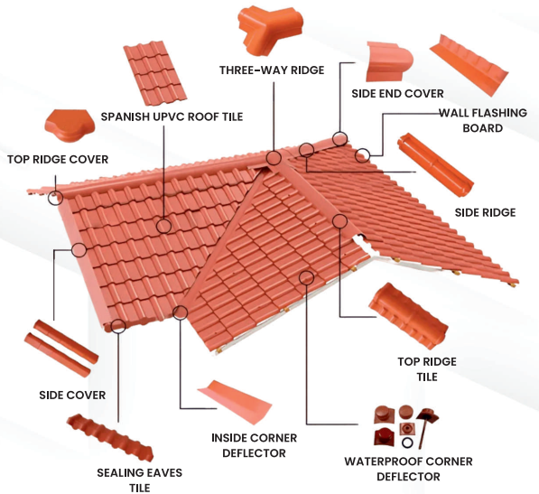 The Spanish Style UPVC Roof tiles use high weather-resistant ASA material, ensuring colour stability for upto 30 years. They are widely used in,